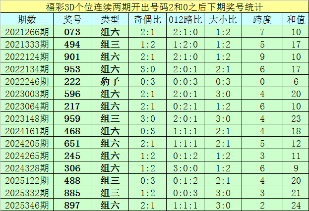 个位号码:最近两期个位开出号码为2-0,在福彩3D历史开奖中,前后两期个位分别开出号码2-0的奖号出现了79次。最近15期个位2-0组合出现之后,其下期奖号分别为:073-494-901-953-222-596-217-959-468-651-245-306-488-885-897;