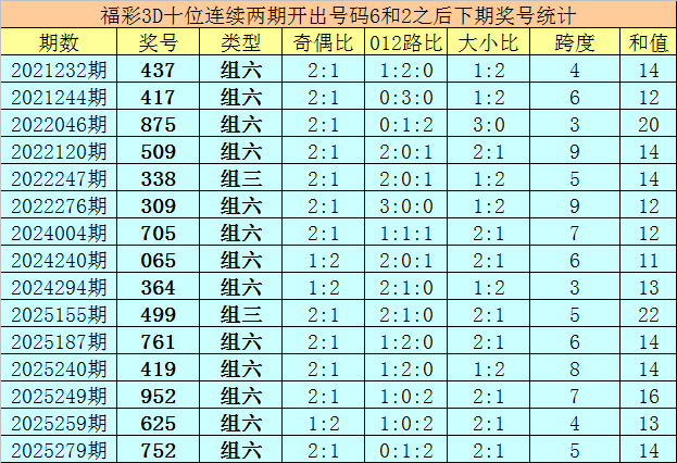 十位号码:前两期十位分别出现奖号6-2,历史上福彩3D连续前后分别开出号码6-2的现象共开出75次。在十位6-2的现象出现时,庄闲和游戏app最近15期其下期分别开出号码:437-417-875-509-338-309-705-065-364-499-761-419-952-625-752;