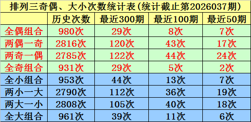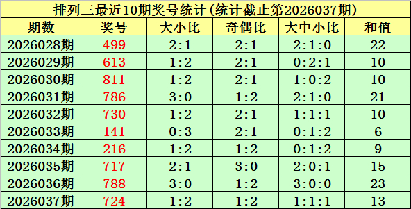上期回顾:排列三第2026037期奖号为:724。奖号类型:组六,和值:13,奇偶比:1:2,跨度:5,大小比:1:2。