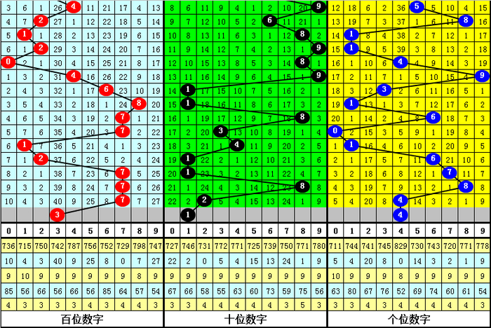 末位跨度分析:前3期末位奖号为7-8-4,最近两期末位奖号跨度为1、4,末位奖号跨度历史上连续两期开出1、4的现象共161次,其最近两次奖号为: