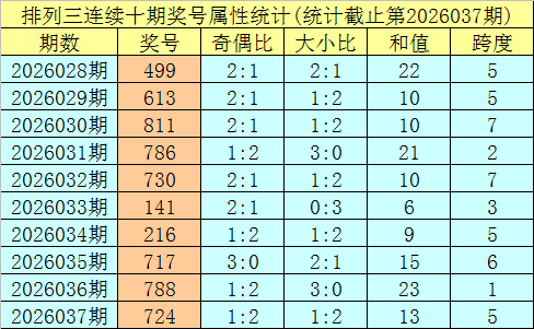上期回顾:排列三第2026037期奖号:724。类型:组六,奇偶形态:奇偶偶,大小形态:大小小,和值:13,跨度:5。