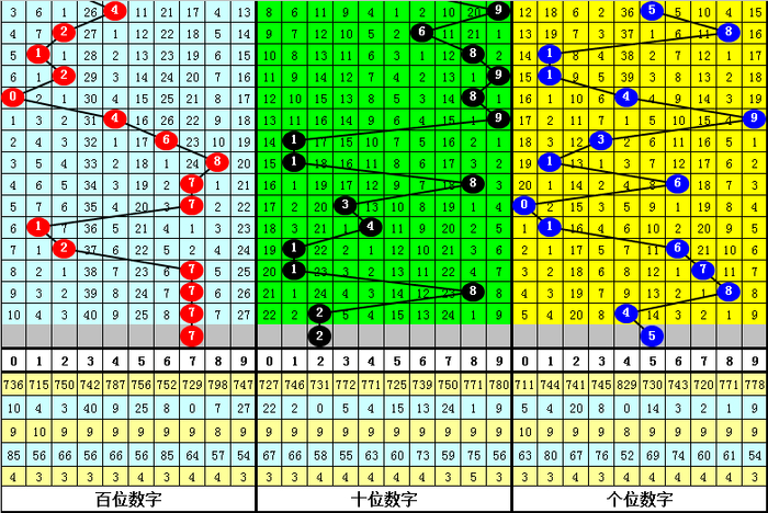 在最近9期开出奇偶分布:奇偶偶的奖号为:148-980-164-900-126-920-522-786-788,在下期出现号码分别为:687-939-900-255-509-030-477-730-724。其中百十个位号码分布情况如下: