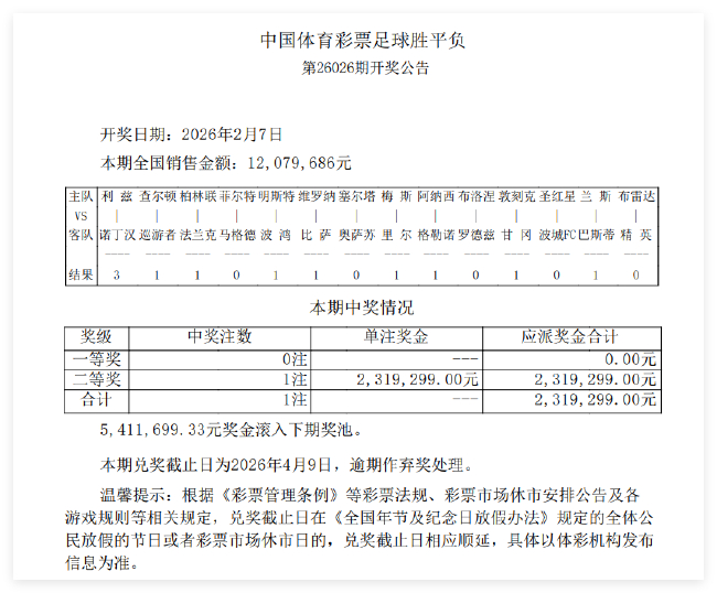 北京时间2月7日,足彩第26026期开奖结果揭晓。本期14场1等空开,541万滚存至第26027期竞猜;14场2等开出1注,单注奖金231万;任九开出39注,单注奖金24万元,为今年以来最高任九奖金。本期14场销量为12,079,mg平台app686元,任九投注总额为14,633,934元。